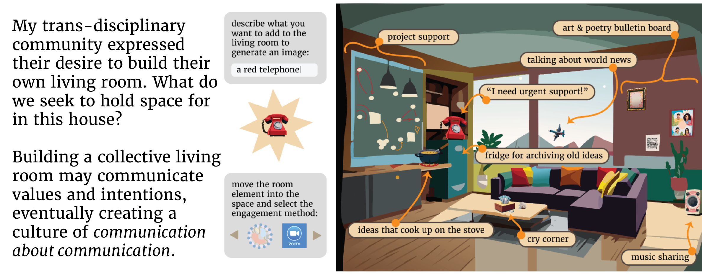 This idea relates to above as a way to integrate ways of sharing intentionally into a space. Just as the movement building container from above integrates a project into the landscape of future change-makers, this living-room containers allows group members to contextualize their sharings metaphorically. Here, a visual leverages intuitive understanding of intentions and needs that can be lost in typical chat spaces.