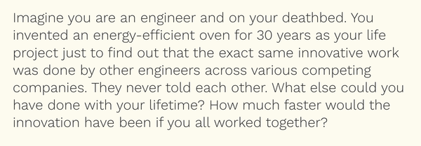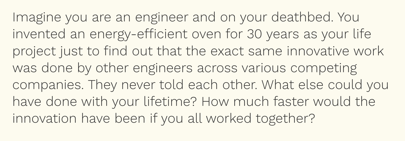 Imagine you are an engineer and on your deathbed. You invented an energy-efficient oven for 30 years as your life project just to find out that the exact same innovative work was done by other engineers across various competing companies. They never told each other. What else could you have done with your lifetime? How much faster would the innovation have been if you all had worked together?