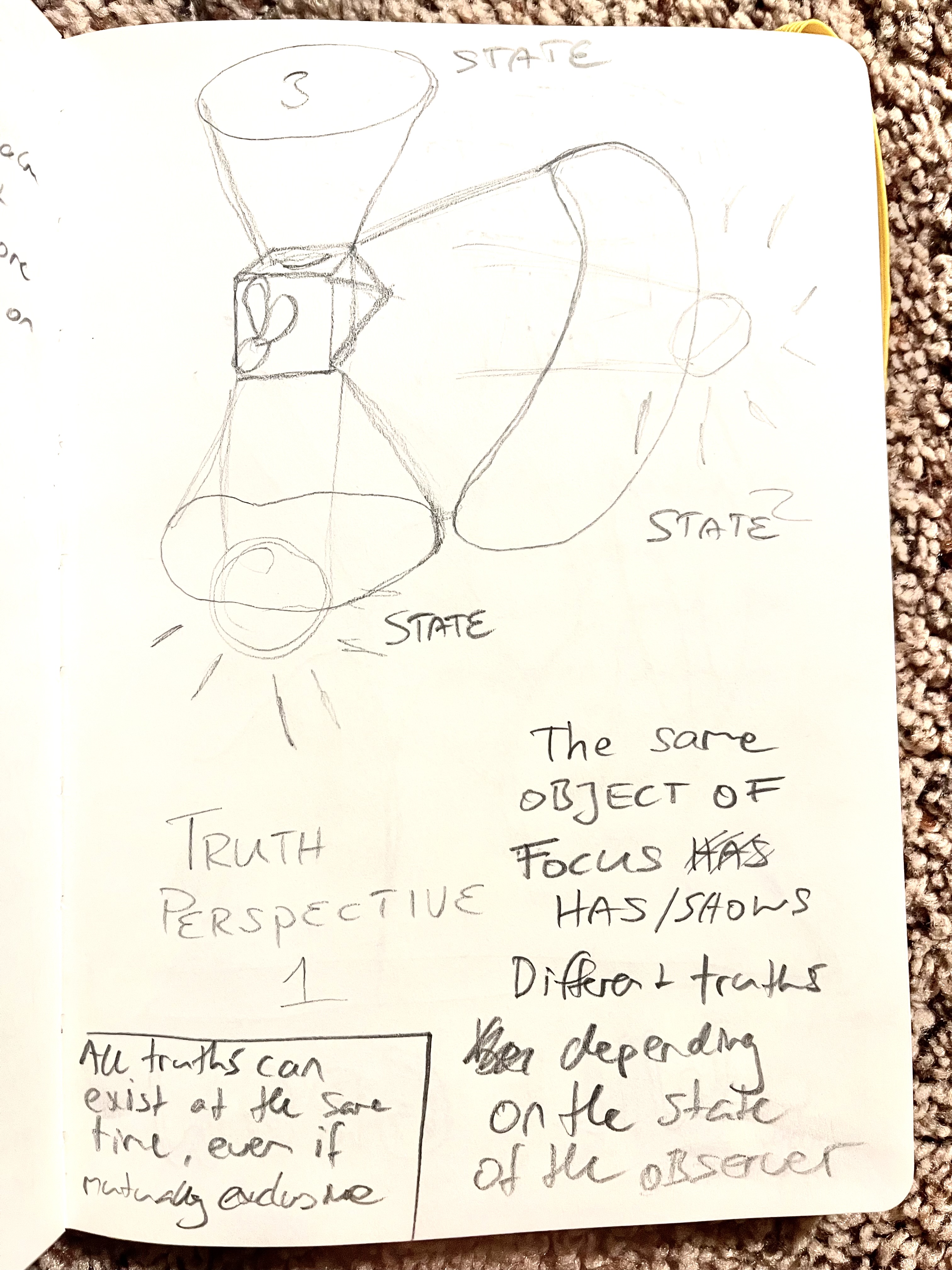 This is just a drawing that grew out of a conversation with a friend. This perspective on truth, that several (opposing) truths can co-exist at once, has impacted my understanding of the world since then.