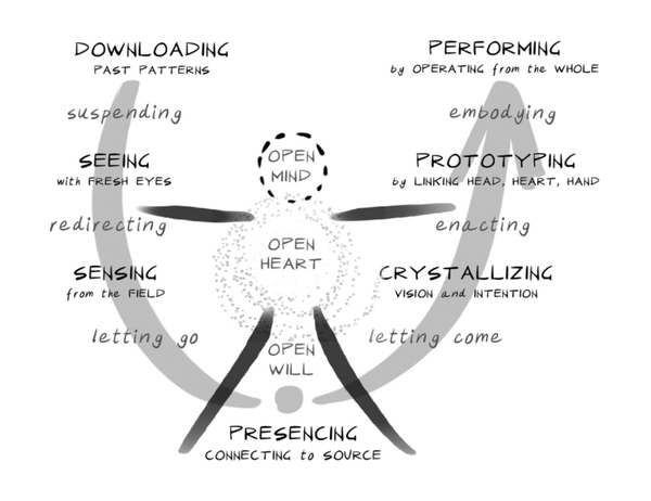 The Theory U is a method written by Otto Scharmer and Katrin Kaufer for change-makers. It acknowledges the unpredictable nature of any discovery process, the importance of social fields, and the presence of an internalized systemic model. His core ideas are very much aligned with my perspective on holistic science and give guidance for sensing future opportunities.